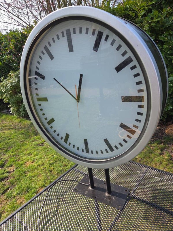 Prachtige originele grote dubbele stationsklok van metaal en glas, ideaal voor binnen of buiten. Diameter 70cm, totale hoogte 90cm. Ik heb het binnenwerk vernieuwd met quartz klokken op batterij. ( origineel niet werkend electrisch binnenwerk merk Nufa met wijzers zit 2x nog bij de klok)