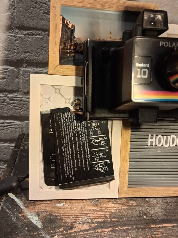 Polaroid Instant camera lamp. Unieke vintage Polaroid Instant 10 lamp! Deze bijzondere lamp is gemonteerd op twee fotolijsten, een klembord en een letterbord, wat zorgt voor een speels en artistiek effect. De metalen gebruiksaanwijzingen van de camera zijn bevestigd aan het klembord. De lamp kan zowel staan als aan de muur worden gehangen. Een echte eyecatcher voor elk interieur! Smile en Houdoe!